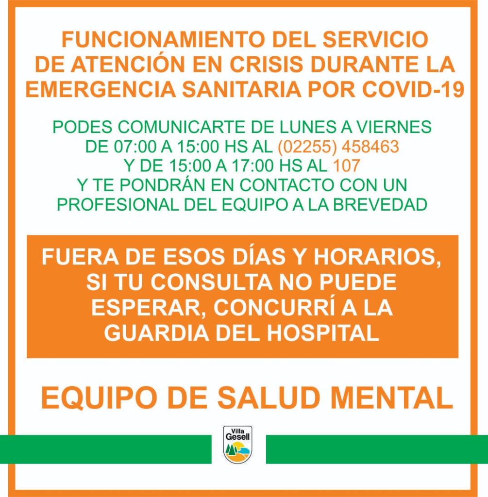 En el contexto de la cuarentena por el COVID-19, el área de Salud Mental del hospital, informa sobre un servicio de atención en crisis durante la emergencia sanitaria que consta de un teléfono al que se puede llamar de lunes a viernes, como al 107, además de aclarar que fuera de esos días y horario si la consulta no puede esperar, las personas en problemas pueden recurrir a la guardia del hospital.