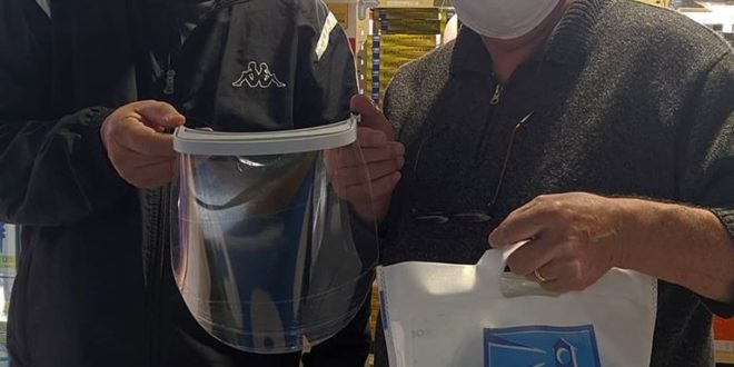 En este caso se trata de la donación de 10 máscaras faciales por parte del local de materiales eléctricos Geselec. «Es un granito de arena para ayudar a la gente de la Cooperadora», comentó José Bats, el dueño del comercio.
