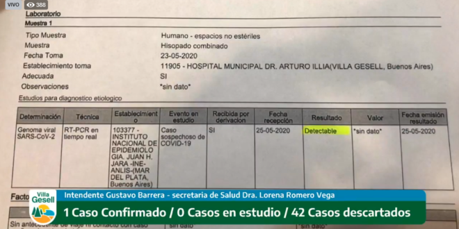 «El caso positivo lo tenemos», afirmó el intendente esta mañana y agregó: «Nosotros no mentimos, damos la cara», mientras mostraba el papel del resultado realizado en el INE de Mar del Plata en el que se lee Detectable.