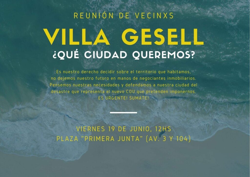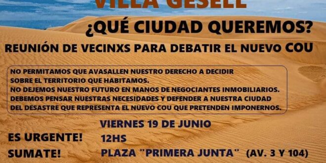 Los vecinos autoconvocados que no se quieren quedar afuera del debate del proyecto que el intendente Gustavo Barrera envió al Concejo Deliberante para modificar el Código de Ordenamiento Urbano y Territorial de Villa Gesell, se verán las caras nuevamente el viernes 20 a las 12 en la Plaza Primera Junta. Se preguntan Qué ciudad queremos? Porque consideran que «es un derecho decidir sobre el territorio que habitamos» y que la norma no responde a sus expectativas sobre el desarrollo urbanístico del partido.