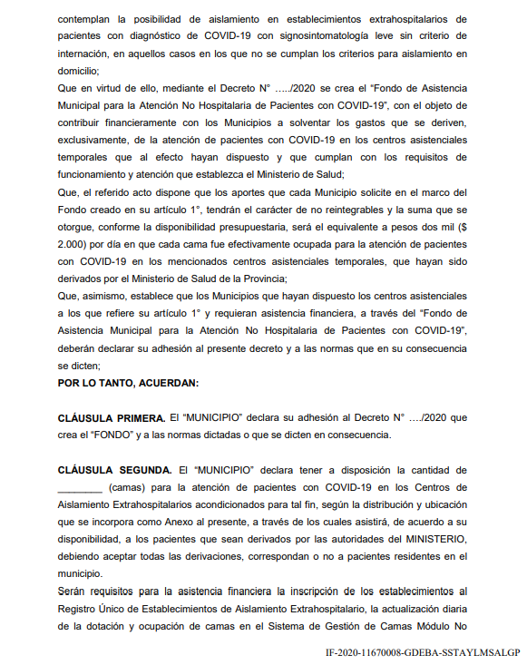 Entre las cláusulas claves del Decreto 495/2020 cita la retribución económica que cada municipio recibirá por parte de la provincia si recibe pacientes no hospitalarios que padezcan COVID-19, qué sucede si hay algún tipo de incumplimiento en las atenciones y en ninguna de ellas aclara o determina zonas de traslados acorde al domicilio de los infectados.