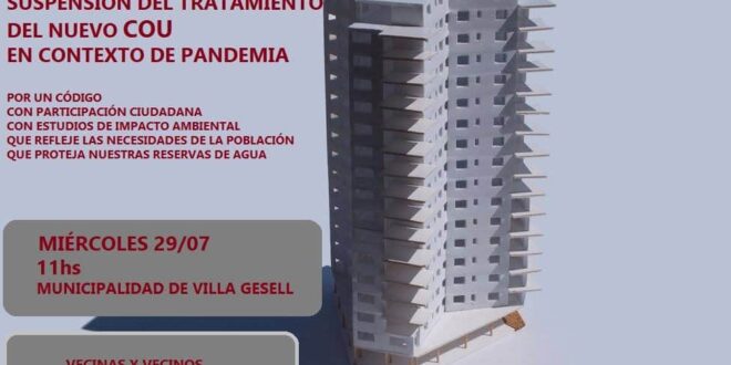 Habiendo visto que en nuestro municipio, los últimos meses de aislamiento generalizado han sido aprovechados para avanzar sobre el territorio con obras y proyectos que no cuentan con el respaldo de las evaluaciones de impacto ambiental correspondientes; ni con la deliberación ciudadana y licencia social indispensables. Claros ejemplos son los casos que hoy nos ocupan: 1) la instalación de antenas con nueva tecnología por parte de empresas no locales y con anuencia gubernamental; 2) la pretendida aprobación de un desastroso COU, cuyos numerosos “errores y descuidos” que solo favorecen a la especulación inmobiliaria, pueden verse en gran medida analizados en la «evaluación particular” del informe realizado por la Dirección Provincial de Ordenamiento Urbano y Territorial, en base al proyecto presentado por el municipio. Cabe aclarar, además, que en dicho COU no han sido incorporadas ni una sola de las innumerables observaciones realizadas por instituciones, vecinas y vecinos del Partido de Villa Gesell, organizaciones ambientales, profesionales arquitectos y urbanistas, que a lo largo del año 2018, se reunieron semanalmente para debatir las implicancias del proyecto.