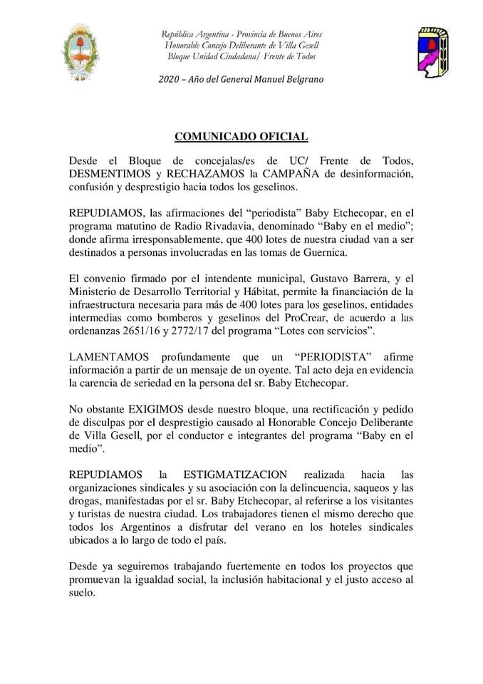 Los concejales oficialistas difundieron un comunicado en contestación a declaraciones que el periodista radial realizó hoy en su programa Baby en el medio, que se emite en Radio Riadavia, al decir que 400 lotes en Villa Gesell serían destinados a familias que serán desalojadas de los terrenos de Guernica.
