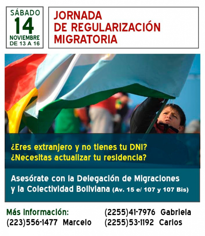 El sábado 14 de noviembre, de 13 a 16 horas, la Delegación Regional de Migraciones en Villa Gesell, a cargo de Erika Valdez, y la Colectividad Boliviana, llevarán a cabo dicha jornada para asesorar sobre trámites migratorios.