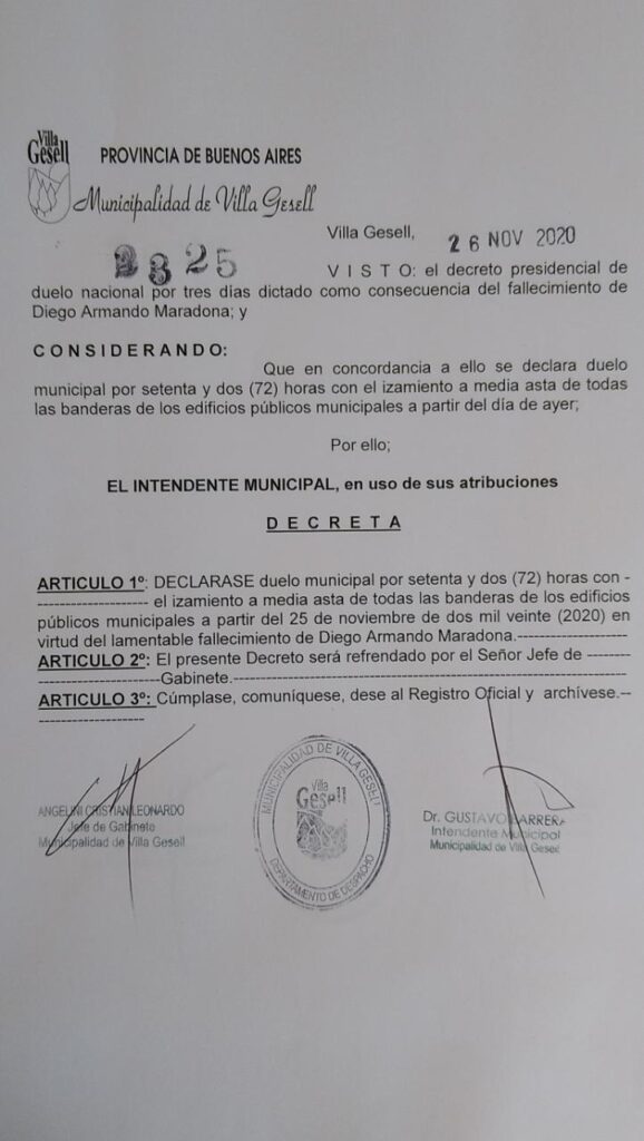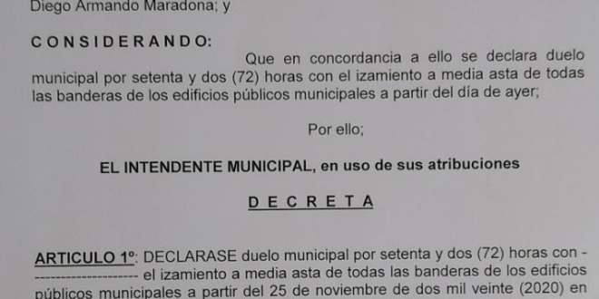 Mediante un decreto el intendente Gustavo Barrera decretó duelo municipal desde ayer por la tarde y por el plazo de tres días. La medida incluye el izamiento a media asta de todas las banderas de los edificios públicos municipales.