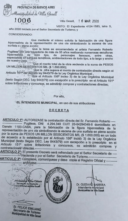 La figura hiperrealista que presentó la semana pasada el intendente Gustavo Barrera estuvo a cargo del artista plástico y abogado Fernando Pugliese, famoso por su criaturas que abundan en su atelier de la calle Darwin en Caba. La compra del producto se realizó en el mes de marzo y como superó el límite para una contratación directa, el Ejecutivo municipal en uso de sus atribuciones, le puso la firma y decretó la fabricación de «una figura de la representación de una ola simbolizando la escena de un surfista en plena acción».