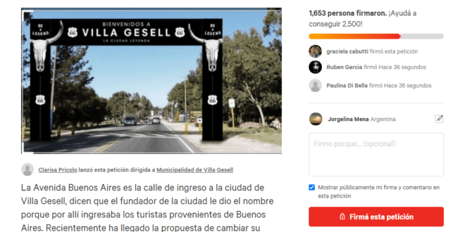 Más de 1600 vecinos desde ayer firmaron la petición realizada en la plataforma Change.org para que no se modifique el nombre a la Avenida central de ingreso a Villa Gesell, después de enterarse que un proyecto de ordenanza del bloque oficialista busca rebautizar a la arteria que nace en Ruta 11 como Diego Armando Maradona.