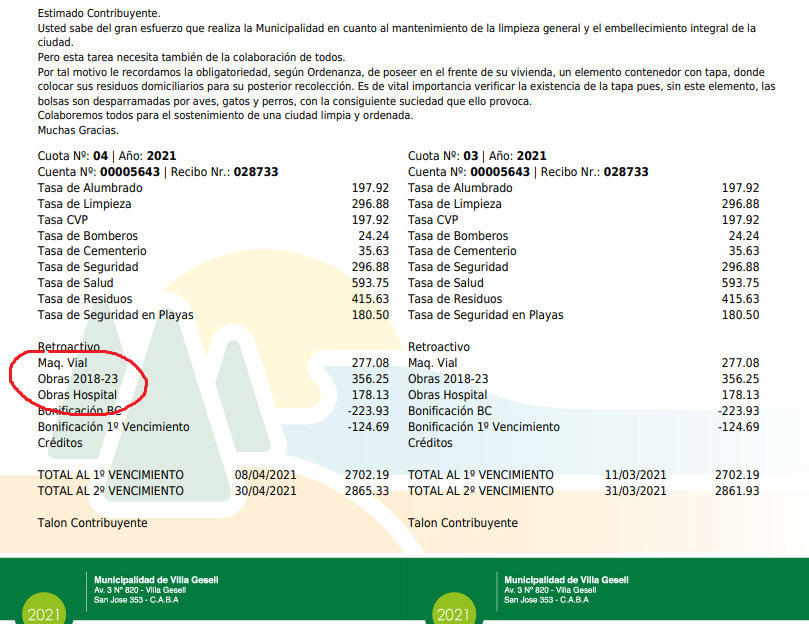 La tasa municipal de los últimos periodos (marzo y abril) da cuenta de que lo que vecinos y vecinas vienen pagando hace más de un año y deberán hacerlo por cuatro años más, es una importante cantidad de dinero que no se sabe a qué se está destinando, ya que está claro que en lo que Gustavo Barrera considera una utopía y un sueño, no hay ni una pared levantada. Según declaraciones del propio intendente y de los funcionarios provinciales que han visitado el distrito durante los últimos meses, el hospital que tanto necesita Villa Gesell dependerá de una inversión provincial y nacional. Mientras tanto es un misterio en qué se utiliza la recaudación municipal de ese concepto que en la boleta figura como «Hospital Gesell».