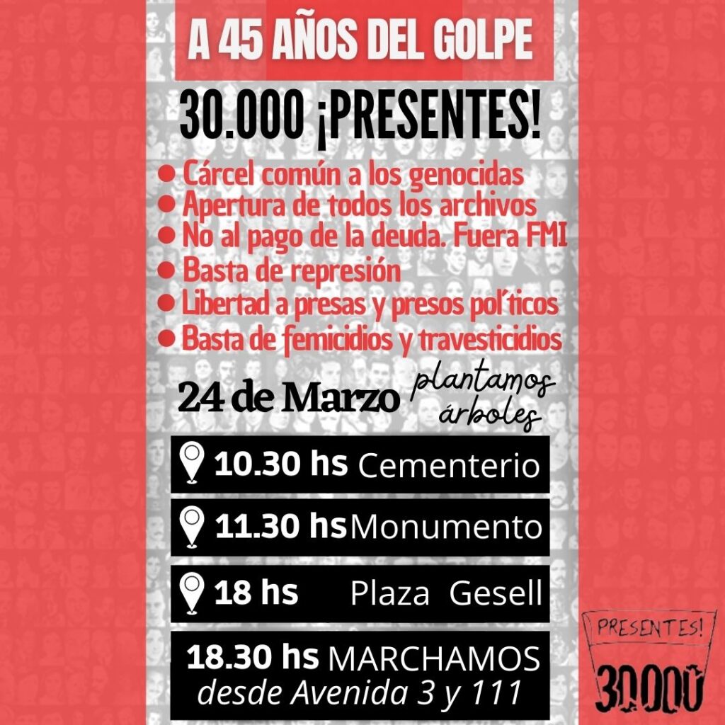 El miércoles 24 de marzo hay agenda en Villa Gesell en el marco del El Día Nacional de la Memoria por la Verdad y la Justicia. «Desde hace 45 años del golpe cívico, eclesiástico y militar convocan desde la Asamblea conformada por organizaciones, vecinos y Encuentro Memoria Verdad y Justicia de Villa Gesell a realizar varias actividades cumpliendo y respetando el DISPO, uso de barbijo y alcohol en gel».