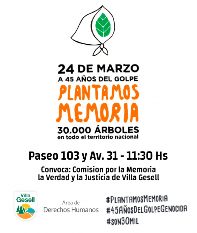 Esta semana se cumplirán 45 años del golpe de estado en la Republica Argentina, y por ello, el Área de Derechos Humanos de la Municipalidad y la Comisión por la Memoria, la Verdad y la Justicia de Villa Gesell convocan a formar parte de la iniciativa “Plantamos Memoria”.