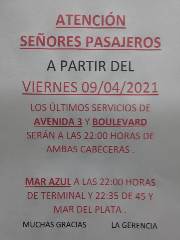 Luego de las medidas de restricción horaria comunicadas ayer por el intendente municipal, el transporte público de pasajeros notifica que a partir de hoy la última salida de los recorridos Avenida 3 y Boulevard será a las 22 horas desde ambas cabeceras. La línea que va a Mar Azul saldrá a las 22 de la terminal y a las 22:35 de calle 45 y Punta del Este.
