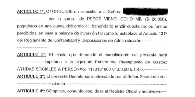 La suma se desprende de los decretos publicados en el boletín oficial con fecha 12 de mayo y bajo el número 1284 y con fecha 8 de abril con el número 1279. El concepto por el que el intendente aprueba la entrega de dinero a vecinos se denomina «ayuda social a personas».