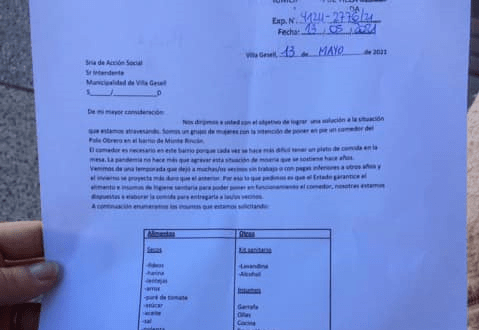 Para ello, las mujeres agrupadas solicitaron formalmente al municipio, al área de Acción Social una lista de productos de todo tipo, frescos y secos, para poder planificar la olla que inicialmente realizarían los días lunes.