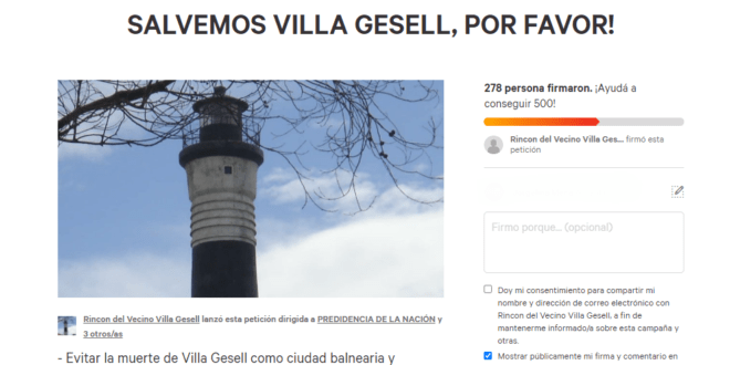 Administradores de un grupo abierto de Facebook denominado El rincón del vecino, han generado una petición en la plataforma de pedidos para sumar firmas Change.org con el fin, como dice su título, «Salvemos Villa Gesell, por favor». La petición sumó en 24 horas casi 300 firmas. Aquí, el texto completo, que está dirigido a