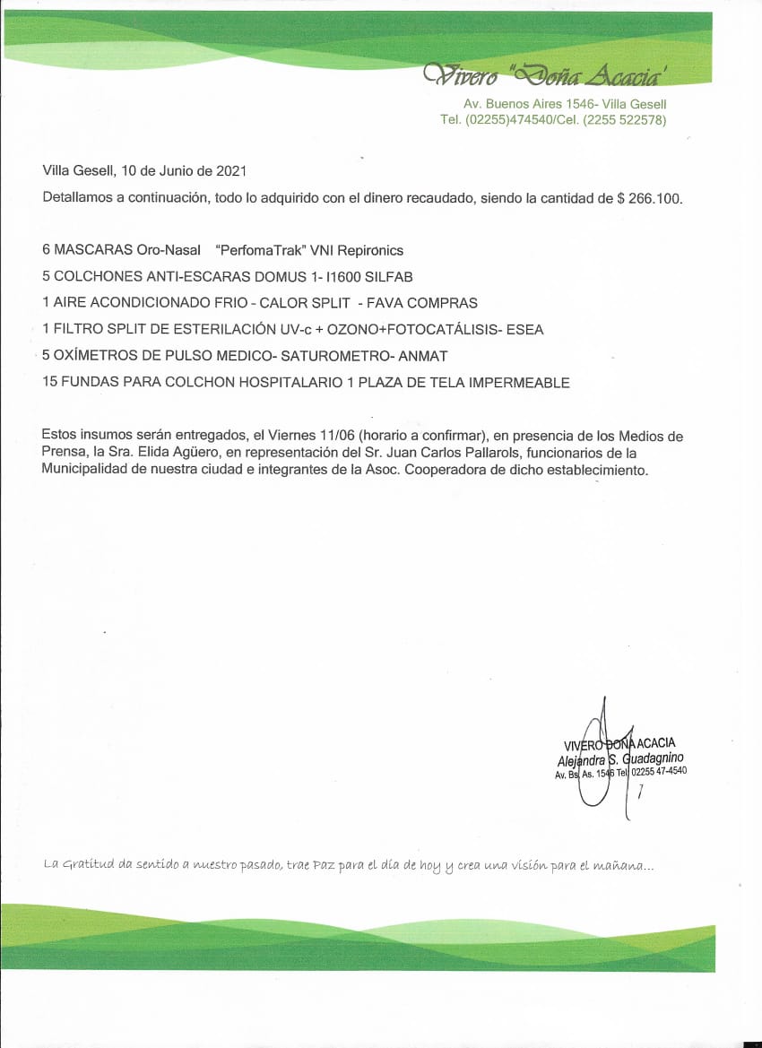 Mañana, la vecina Alejandra Guadagnino del Vivero Doña Acacia y organizadora de la subasta de la rosa del artista Juan Carlos Pallarols, hará entrega de los productos comprados para el hospital municipal. Mascaras nasales, colchones anti escaras, aire acondicionado, filtro de esterilización, oxímetros y fundas para colchones es la adquisición en la que se invirtieron los 266.100 pesos obtenidos gracias al gesto solidario del reconocido orfebre y la gestión de la comerciante.