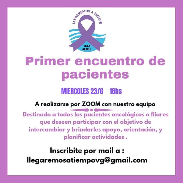 La Ong LLegaremos a Tiempo, presidida por Sandra Cruz, realizará el próximo miércoles 23 de junio un encuentro por zoom con pacientes en tratamiento, recién diagnosticados, que hayan logrado la remisión o también los familiares de todos ellos, con la intención de acompañar los diferentes procesos con la mayor anticipación posible.