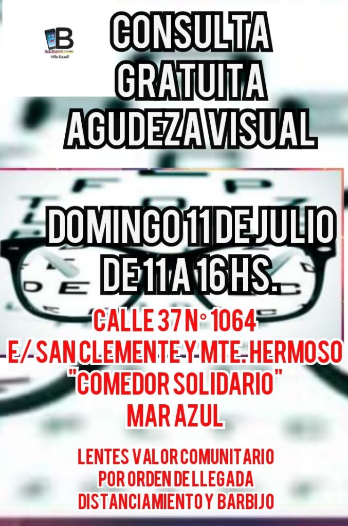 El sábado 10 de julio vecinos podrán acceder de manera gratuita a un control de agudeza visual en el Comedor Solidario Madre Teresa, en Paseo 114 y Av. 15 de 11 a 15:30 horas, mientras que el domingo 11, los testeos se harán en el Comedor Solidario de Mar Azul, ubicado en Calle 37 y Monte Hermoso a partir de las 11 y hasta las 16 horas. Al control lo harán profesionales que recetarán lentes, en caso de ser necesario, a un precio económico. El equipo de Banquemos Villa Gesell, organizador de la jornadas, detalló que pueden asistir todas las personas mayores de 10 años.