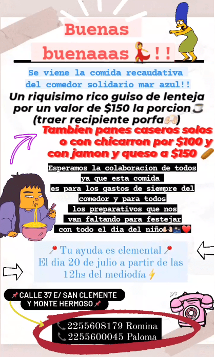 El menú es un guiso de lenteja que tiene un costo de 150 pesos la porción, aunque también se venderán panes caseros solos o con chicharrón a 100 pesos y con jamón y queso a 150 pesos. Los fondos que se recauden serán para los gastos usuales del comedor y para algunos preparativos que quedan para la celebración del día del niño. A partir del mediodía en el comedor ubicado en la calle 37 entre Monte Hermoso y San Clemente en Mar Azul.