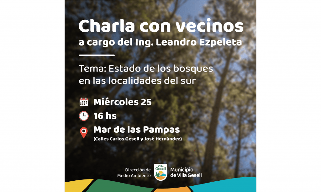 El encuentro se centrará en el estado de los bosques de los pueblos del sur del distrito y estará a cargo de la Dirección de Medio Ambiente junto al área de Vivero y Espacios Verdes. La actividad en la que estará presente el ingeniero forestal Leandro Ezpeleta, se hará en el espacio verde de la Casita de los Peones ubicada en Carlos Gesell y José Hernández. Dudas con lo que le pasa a las plantas, dudas sobre los procedimientos, plagas, etc.