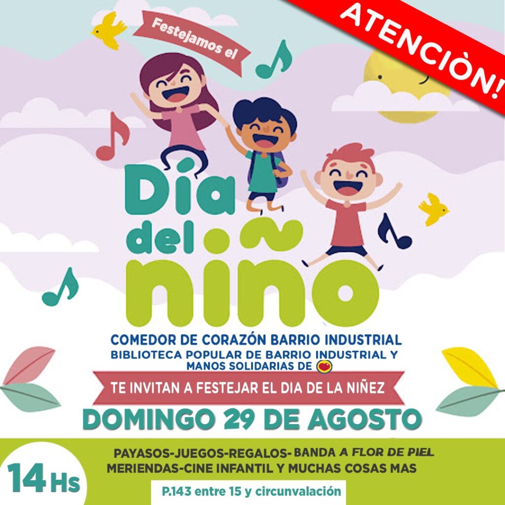 La invitación para celebrar el mes de la niñez en el Comedor De Corazón de Barrio Industrial junto al merendero Manos Solidarias es muy atractiva: CINE (proyectaremos NATACHA, de Luis Piscetti), TALLER DE CHICHES, a cargo del artista plástico Pollasqui, Banda musical A FLOR DE PIEL, Concurso de Manchas, payasos, juegos, regalos, merienda.