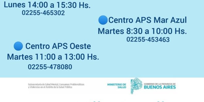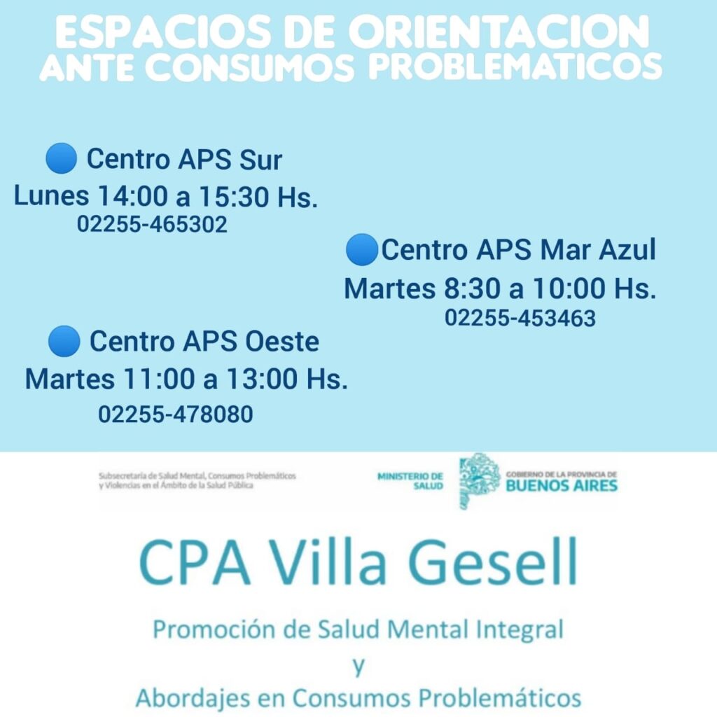 El CPA de Villa Gesell – en articulación con la Secretaria de Salud y junto a la Dirección de Atención Primaria de Salud Municipal- abre a partir de la fecha espacios de Orientación ante los Consumos Problemáticos en los Centros de APS Mar Azul, Sur y Oeste de Villa Gesell.