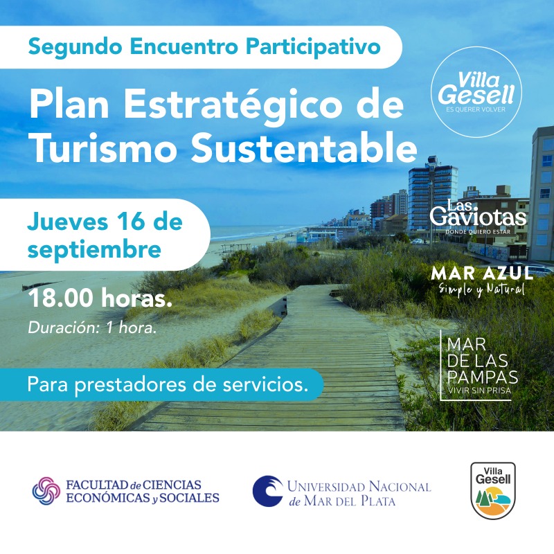 La Municipalidad de Villa Gesell, a través de la Secretaría de Turismo y en conjunto con la Facultad de Ciencias Económicas y Sociales de la Universidad Nacional de Mar del Plata, reitera su invitación a prestadores de servicios a participar del segundo Encuentro Participativo en el Marco Del Plan Estratégico de Turismo Sustentable de Villa Gesell.