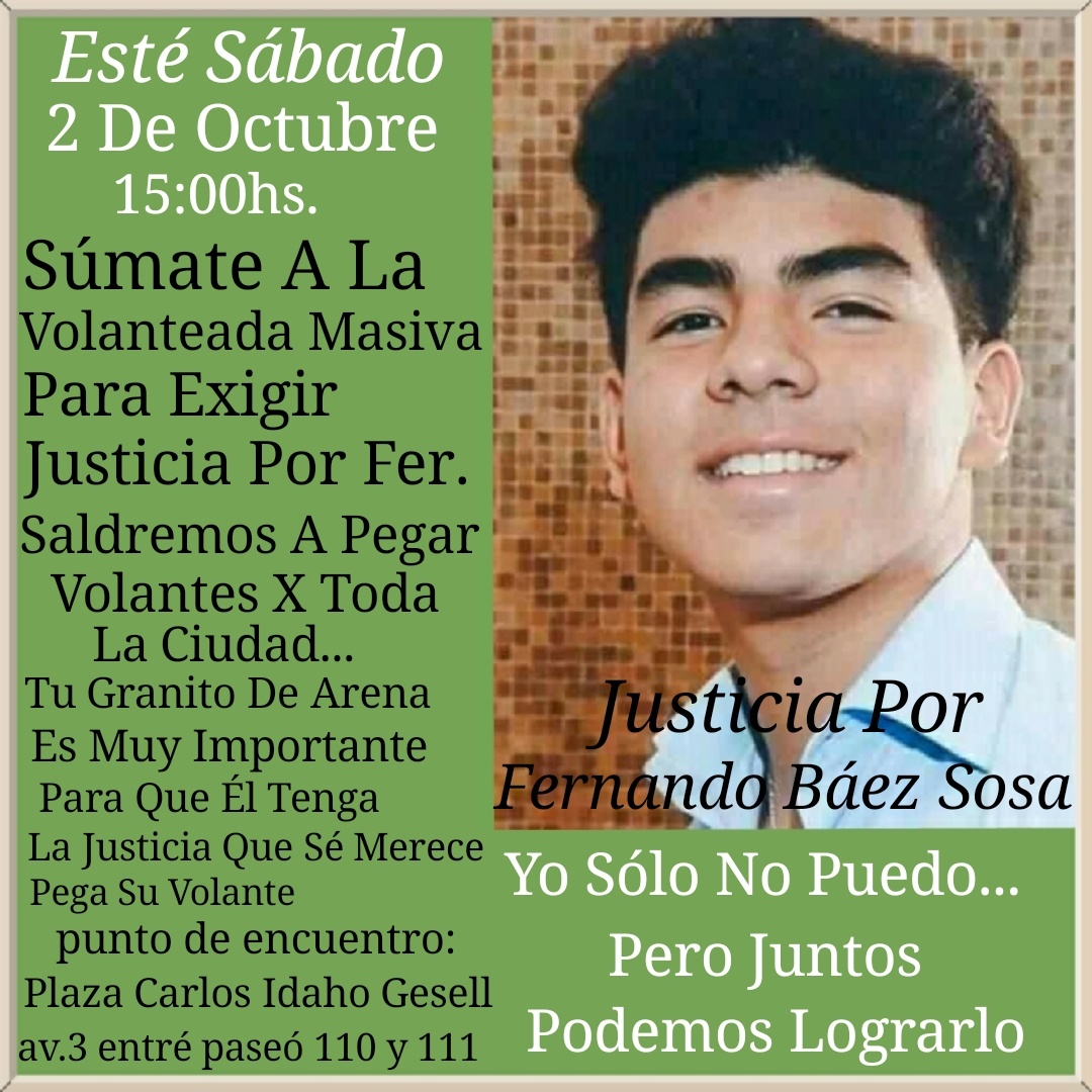 «Sumate a la volanteada masiva» pide la convocatoria de quienes además de esta iniciativa en apoyo a Graciela Sosa y Silvino Báez y el eterno y firme pedido de Justicia, estarán presentes en el árbol que se convirtió en santuario sobre la Avenida 3 y Avenida Buenos Aires, el próximo miércoles 6 de octubre a partir de las 19 horas cuando el abogado de la familia de Fernando transmitirá por Instagram un mensaje sobre lo acontecido en la audiencia que se llevará a cabo en Dolores a partir de las 11 de la mañana.
