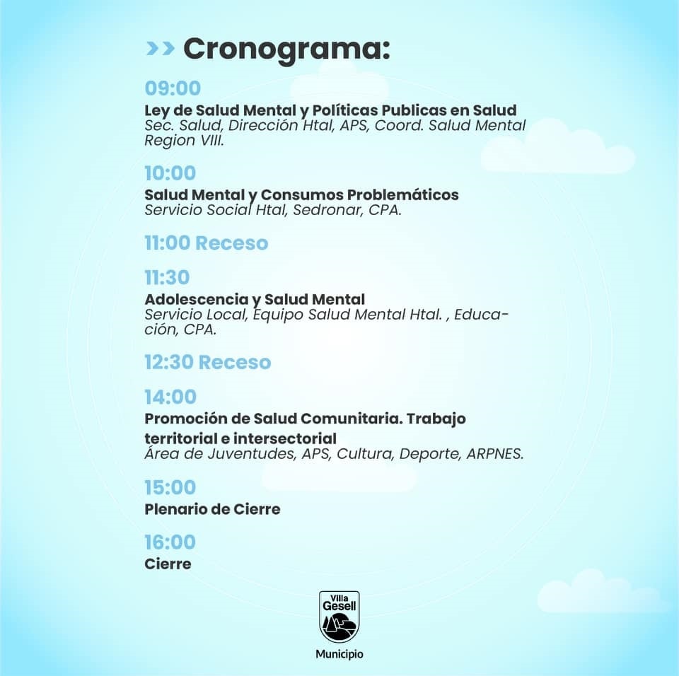 Se tratarán diversos temas con equipos interdisciplinarios. Ley de Salud Mental y Políticas Públicas en Salud. Salud Mental y consumos problemáticos. Adolescencia y Salud Mental. Promoción de Salud Comunitaria. Trabajo territorial e intersectorial. Las disertaciones estarán a cargo de integrantes de la Secretaría de Salud, Dirección, Servicio Social y Equipo de Salud Mental del Hospital Municipal, APS, Coordinación de Salud Mental de la Región Sanitaria VIII, CPA, Sedronar, Servicio Local, Jefatura Distrital de Educación, Inspección de equipos de orientación de escuelas, Área de las Juventudes, Cultura y Deportes y ARPNES.