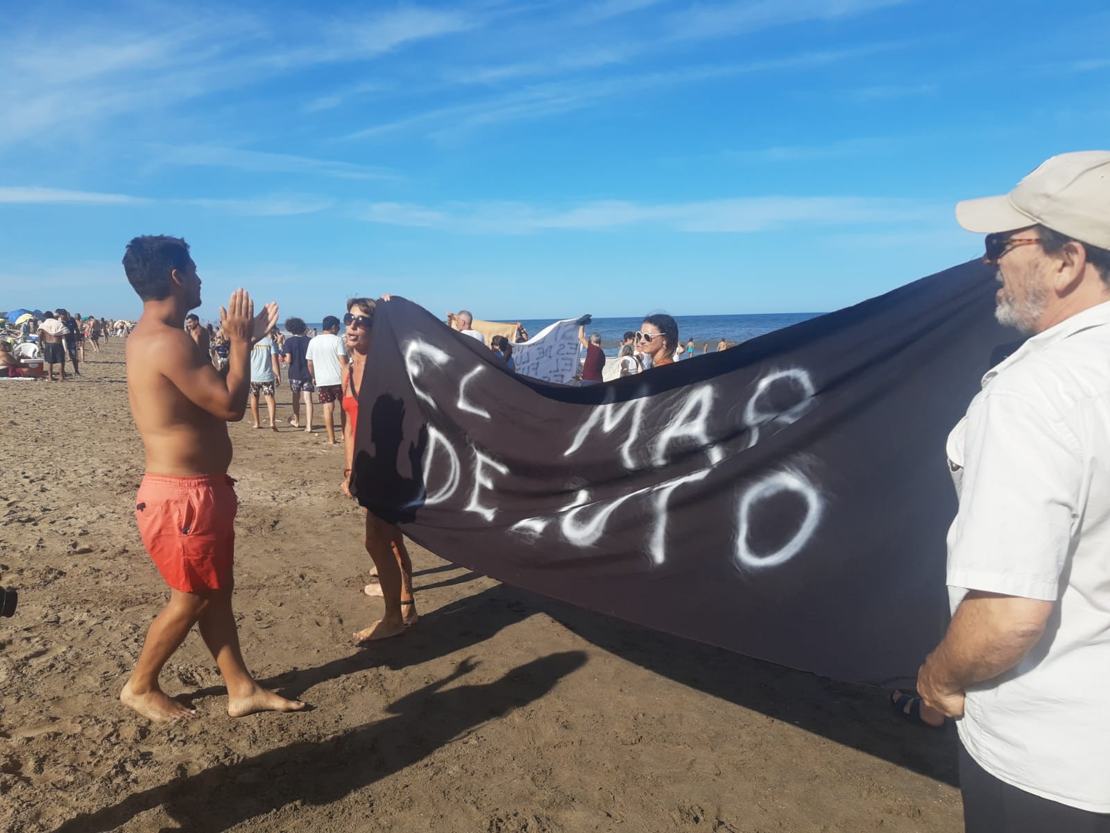 La anterior marcha ocurrió ayer en el muelle geselino por la mañana y hoy unos 50 defensores del ecosistema marítimo y el medio ambiente costero se hicieron presentes en la playa de Mar de las Pampas con banderas y carteles para proseguir con el reclamo y la concientización sobre los riesgos de las exploraciones sísmicas que la empresa Equinor tiene permitido efectuar para detectar petróleo.