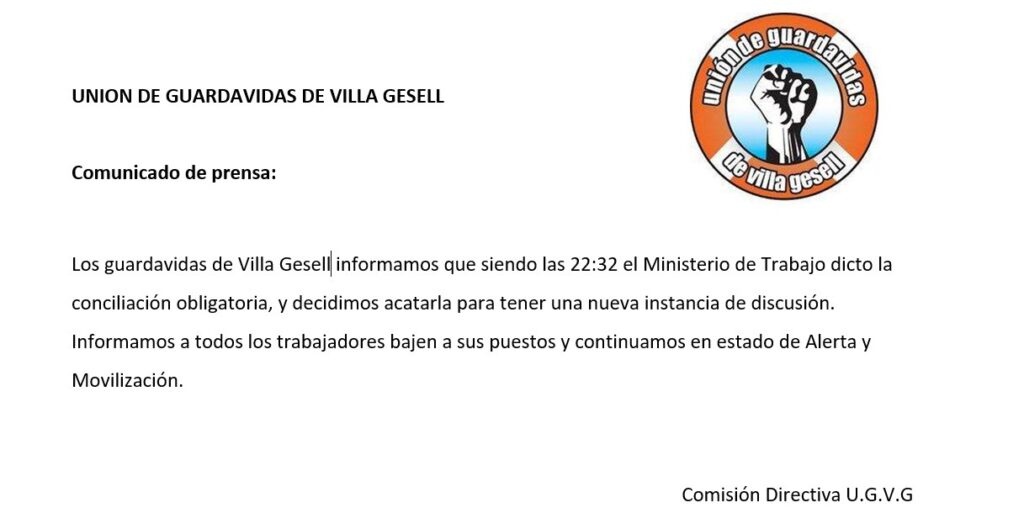 La Unión de Guardavidas de Villa Gesell notificó anoche que a las 22:30 horas el Ministerio de Trabajo dictó la conciliación obligatoria, por lo que se decidió acatarla y suspender el paro de actividades programado para hoy, hasta tener una nueva instancia de discusión. El Estado de Alerta y Movilización continua.