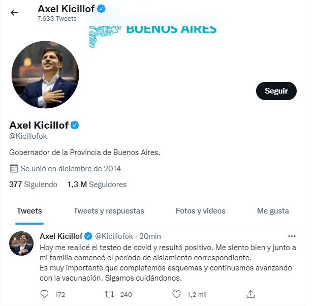 Axel Kicillof publicó en Twitter esta noche: «Me realicé el testeo de covid y resultó positivo. Me siento bien y junto a mi familia comencé el período de aislamiento correspondiente. Es muy importante que completemos esquemas y continuemos avanzando con la vacunación. Sigamos cuidándonos».