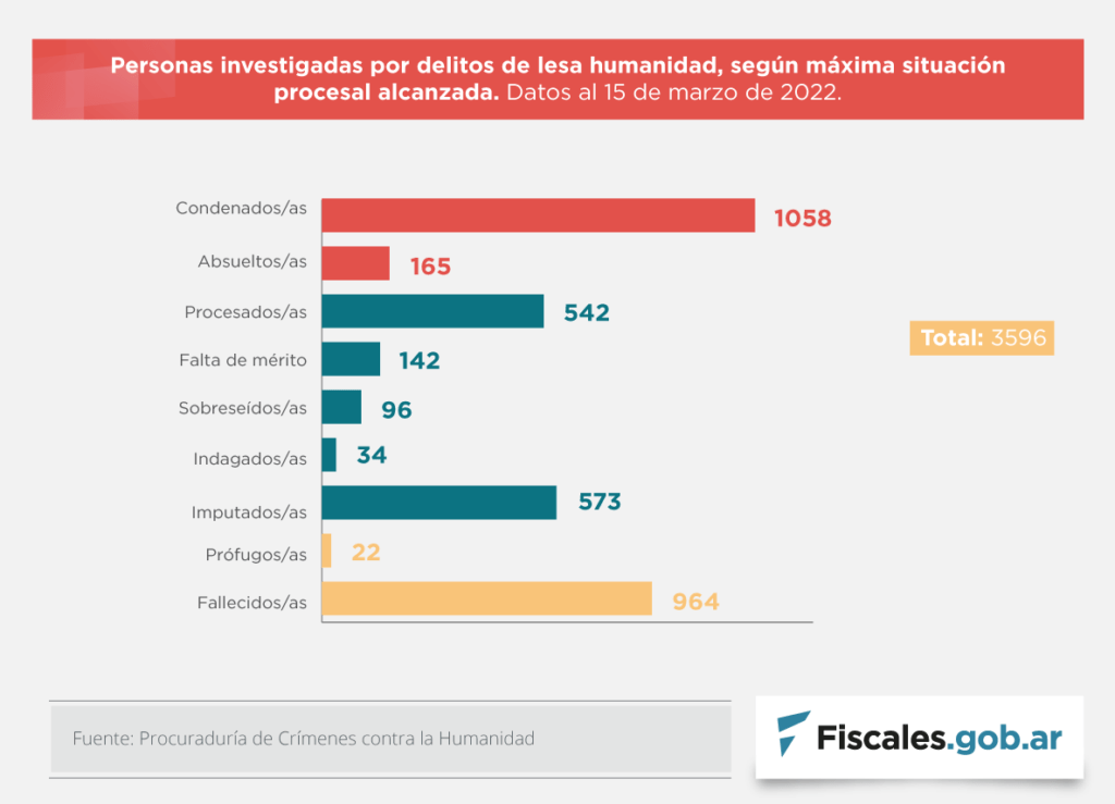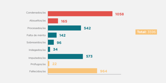 En la actualidad 22 personas se encuentran prófugas de la justicia, desconociendo su paradero. Desde el inicio de los procesos hasta la actualidad fallecieron antes de obtener sentencia 964 personas investigadas por crímenes de lesa humanidad.
