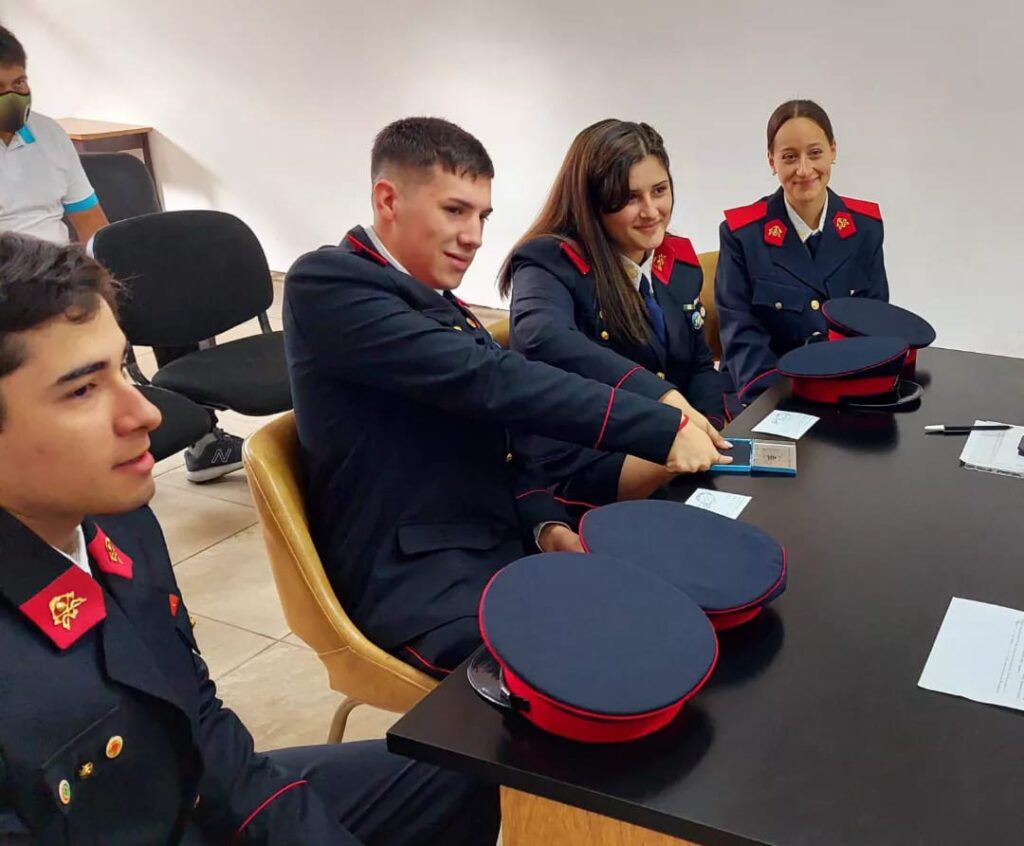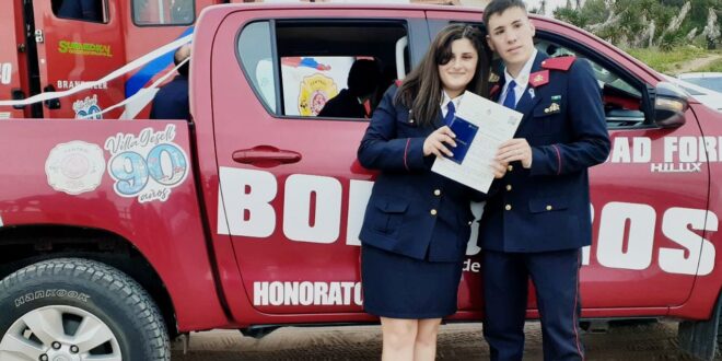 Candela Chimera y Valentino Iriart se casaron en la mañana de hoy vestidos con el uniforme de gala bomberil. Los jóvenes se conocieron en la escuela secundaria, tienen 20 años y hoy formalizaron la relación en una ceremonia que tuvo la vocación de servicio que ambos eligieron, como parte del acontecimiento.