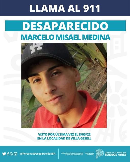 Continúa la búsqueda de Marcelo Misael Medina de 19 años, que se escapó de su casa hace 14 días. Además de los operativos de búsqueda activos en Villa Gesell y el alerta del Ministerio de Seguridad de la Provincia de Buenos Aires, sus familiares y amigos salen todos los días a pegar carteles con su imagen para que toda la gente esté en conocimiento de su desaparición y pueda dar aviso sobre su paradero o datos que lleven a él.