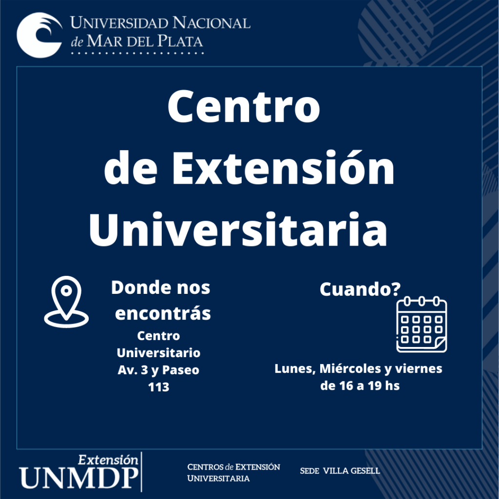 El Centro de Extensión Universitaria con sede en Villa Gesell, recientemente inaugurado, es un dispositivo dependiente de la Secretaría de Extensión Universitaria de la UNMDP, que tiene por función trabajar de manera articulada con instituciones, organizaciones y vecin@s de los diferentes Barrios y localidades del Partido de Villa Gesell. Funcionará lunes, miércoles y viernes de 16 a 19 horas en el Centro Universitario de Avenida 3 y Paseo 113.