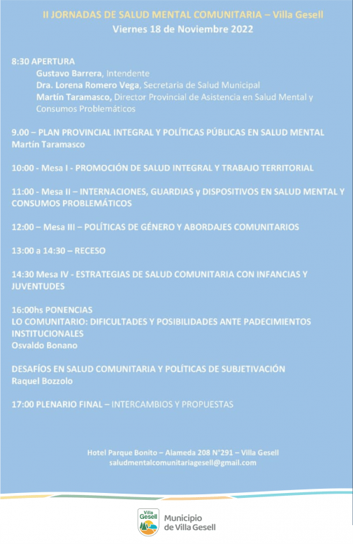 La actividad, impulsada por la Secretaría de Salud en conjunto con la mesa intersectorial de Salud, tendrá lugar el próximo viernes 18 de noviembre a partir de las 8.30 hs, en el Hotel Parque Bonito, ubicado en Alameda 208 entre Calle 303 y Avenida Buenos Aires.