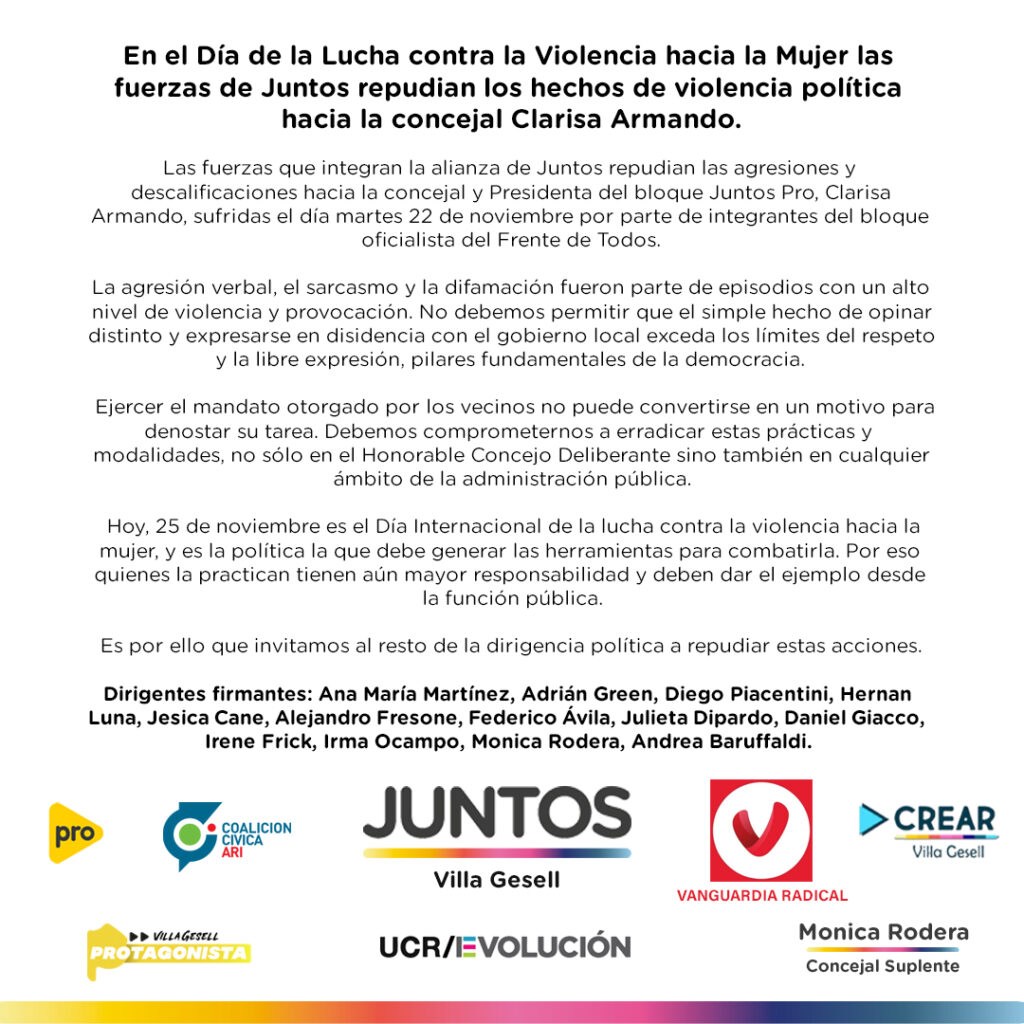 En el marco del Día Internacional contra la Violencia hacia la Mujer, las fuerzas que integran la alianza de Juntos repudian las agresiones y descalificaciones hacia la concejal y Presidenta del bloque Juntos Pro, Clarisa Armando, sufridas el día martes 22 de noviembre por parte de integrantes del bloque oficialista del Frente de Todos.