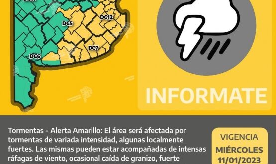 El área será afectada por tormentas de variada intensidad, algunas localmente fuertes. Las mismas pueden estar acompañadas de intensas ráfagas de viento, ocasional caída de granizo, fuerte actividad eléctrica y abundante caída de agua en cortos períodos.