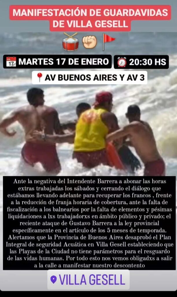 La Unión de Guardavidas, luego de una asamblea realizada ayer por la noche, resaltó que «ante la negativa del Intendente Barrera a abonar las horas extras trabajadas los sábados y cerrando el diálogo que estábamos llevando adelante para recuperar los francos, frente a la reducción de franja horaria de cobertura y ante la falta de fiscalización a los balnearios», realizará una movilización mañana martes a las 20:30 horas en Avenida Buenos Aires y Avenida 3.
