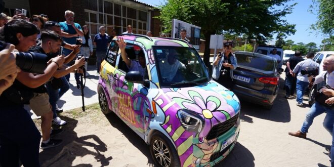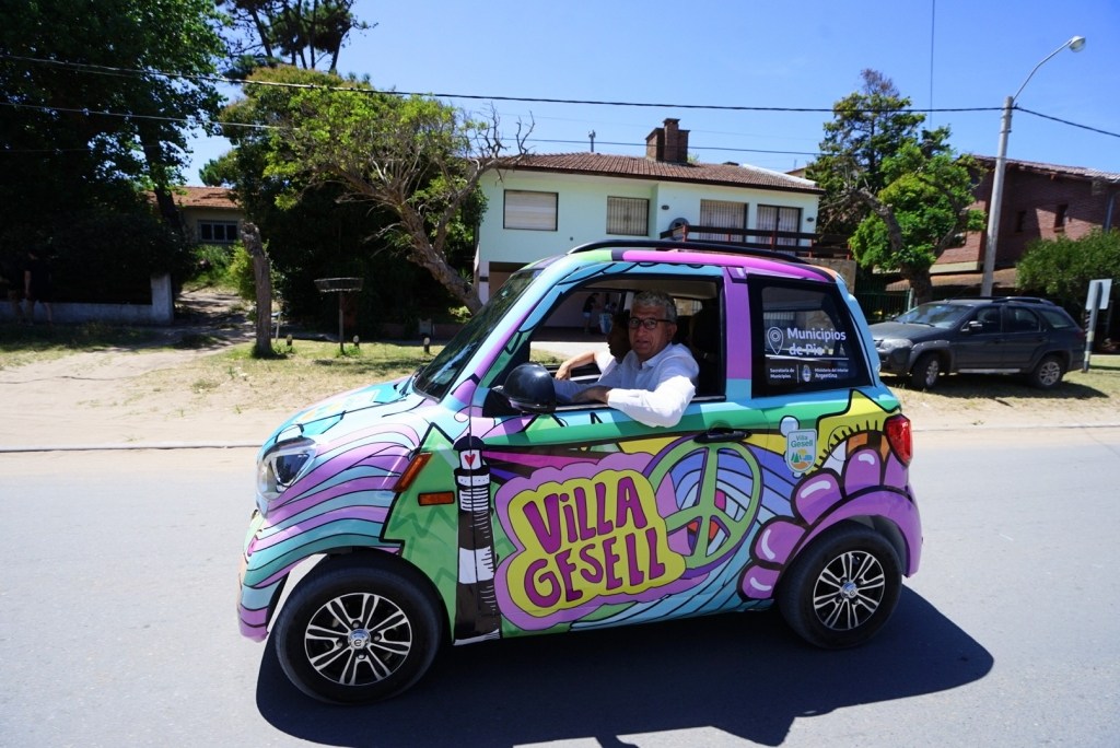 Pero más allá de la rutina formal entre el Ejecutivo municipal, el gobernador y la vicegobernadora y la posterior mateada en la playa con militantes, lo que hizo mucho ruido fue la presentación de un auto eléctrico presentado como Tito, ploteado con dibujos referidos a Villa Gesell, como el micro adquirido hace unas semanas atrás.