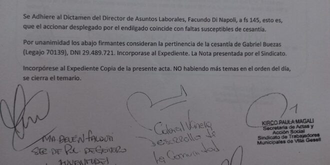 El hecho denunciado por el secretario de Seguridad Mauricio Andersen fue en febrero de 2022 y en abril de ese mismo año, la justicia desestimó y declaró la imposibilidad de que continúe el proceso, sin embargo el último mes de febrero, la Junta de Disciplina del Sindicato de Trabajadores municipales adhirió a la cesantía impuesta por un dictamen del Director de Asuntos Laborales de la Municipalidad de Villa Gesell. Hoy, la Unión de Guardavidas sigue exponiendo la situación irregular y advierte: «Es increíble que un sindicato, en este caso el de municipales, firme unánimemente el despido de un trabajador sobre el que un juez ya determinó su inocencia.