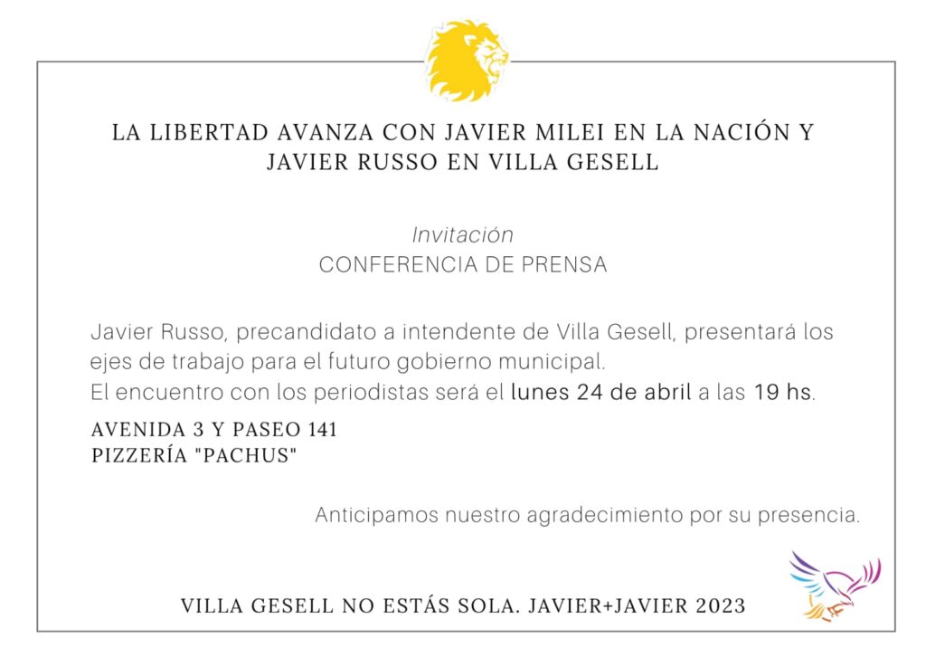 El encuentro con los vecinos y la prensa se llevará a cabo el próximo lunes 24 de abril a las 19 horas en la pizzería ubicada en Avenida 3 y Paseo 141 en Villa Gesell. «Vamos a hacer conocer a toda la comunidad los ejes de trabajo en los que estamos trabajando para lo que podría ser nuestra gestión de gobierno, si la gente nos acompaña con su voto», declaró a Por la 3 el precandidato a intendente Javier Russo. El encuentro, al que se convocó a la prensa local, es de acceso libre para vecinos y vecinas.