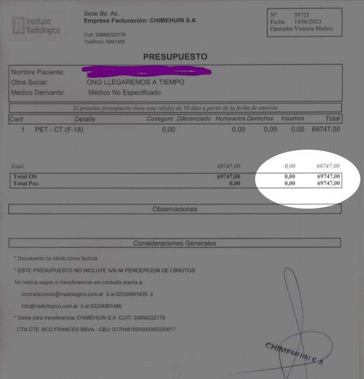 Campaña solidaria de la ONG llegaremos a tiempo con el fin de pagar un estudio de alta complejidad para un paciente oncológico.