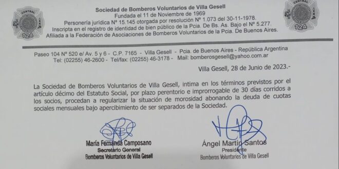 La asociación de bomberos voluntarios de Villa gesell, ante la proximidad de su Asamblea Anual Ordinaria; se encuentra realizando los preparativos para llegar en óptimas condiciones al cierre del actual periodo contable. Ante esa situación, llama a los socios a regularizar las cuotas pendientes.