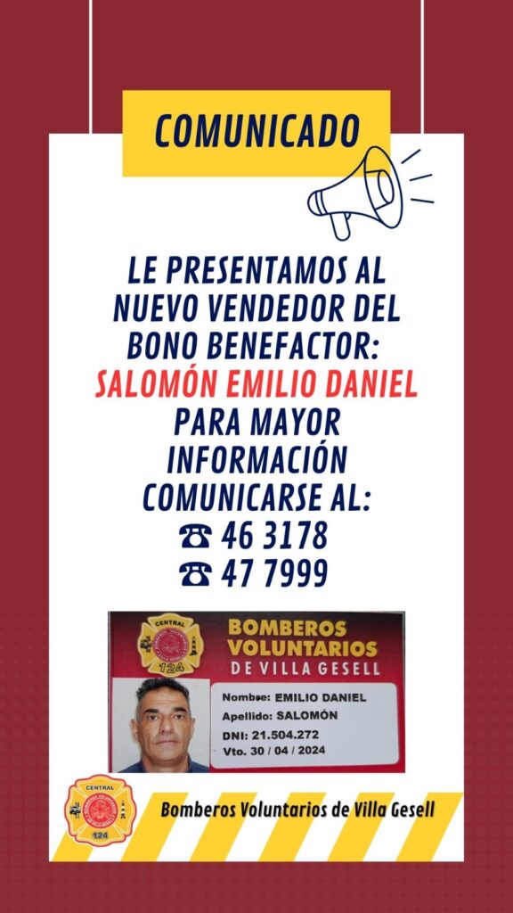 Todos los años Bomberos Voluntarios pone a la venta su bono beneficio para aquellos vecinos que quieran colaborar.Como es sabido la sociedad Geselina caracterizada por su solidaridad colabora con Bomberos, este año también podrán hacerlo también con su nuevo vendedor. Para esta acción solidaria Emilio Daniel Salomón contactará y visitara a aquellos vecinos que deseen colaborar.
