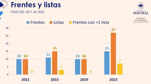 • “En materia de frentes, en 2011 el 30% de los que presentaron lista de candidatos a presidente y vice no alcanzaron el piso mínimo del 1,5%, y quedaron fuera de la competencia electoralEn 2015 fue el 45,45% los que no pasaron a la elección general, y en 2019 el 40%”.