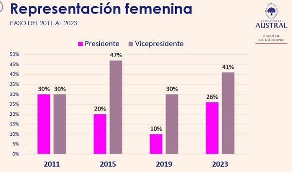 Una cuestión de género En materia de representación femenina, el informe consigna que en las fórmulas de las PASO 2023 se volvió a alcanzar el 67% entre las precandidatas a presidenta y vicepresidenta (26% + 41%), igualando la performance del 2015 (20% + 47%). Con el valor agregado de que las precandidaturas a presidenta resultan mayores, jerarquizando la figura de la mujer en cuanto a roles. “Dicho de otro modo, en paridad de porcentajes globales, hay más candidatas a presidentas en 2023 versus más candidatas a vicepresidentas en el 2015”, se registra.Además, se destaca un dato: “Nunca las candidaturas a presidenta superaron a las de vicepresidenta. Apenas en 2011 las precandidaturas a ambos cargos llegaron a igualarse (30% en ambas)”.Las PASO 2023 rompen con el decrecimiento de las candidaturas presidenciales femeninas operado desde 2011. Sin embargo, en la representación femenina de las fórmulas, ninguna de las dos categorías alcanzó el 50%.