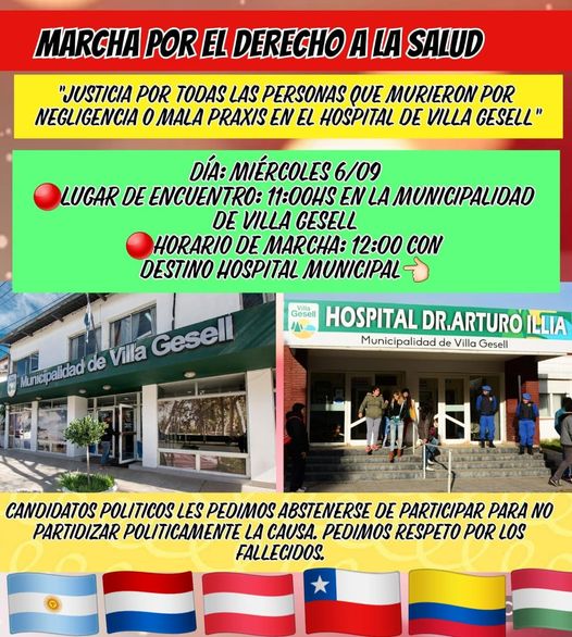 La publicación se originó en la página de Facebook de la Colectividad Boliviana en Villa Gesell, luego del fallecimiento del nene de 6 años, Benjamín Limachi. El día miércoles 6 de septiembre se realizará una marcha pacífica en solicitud y reclamo para un mejor sistema de salud. «Convocamos a toda la comunidad geselina y a aquellos que han perdido un ser querido en condiciones dudosas. Una marcha que se realizará sin banderas políticas», aclara el comunicado.