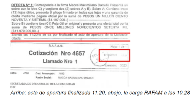 A fojas 52 del expediente D-15081/23 se incluye el pedido de cotizacion 4657, emitido por el sistema RAFAM a las 10.28 del 17 de agosto de 2023. 28 minutos despues se realizaría en el mismo Municipio la apertura de sobres de las ofertas. Una copia de esa acta consta en fojas 34, indicando que la apertura se inició a las 11.00, hubo un solo oferente, el proveedor Maximiliano Macca. Al cierre del acta los funcionarios dejan constancia que el cierre fue a las 11.20.