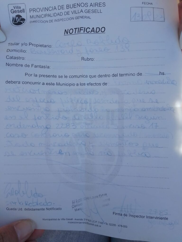 La notificación que recibieron dice que tienen que retirar todo porque están violando la ordenanza 2283 articulo 5 inciso 17 que prohíbe la venta ambulante en el espacio publico y sino le decomisaran la mercadería.